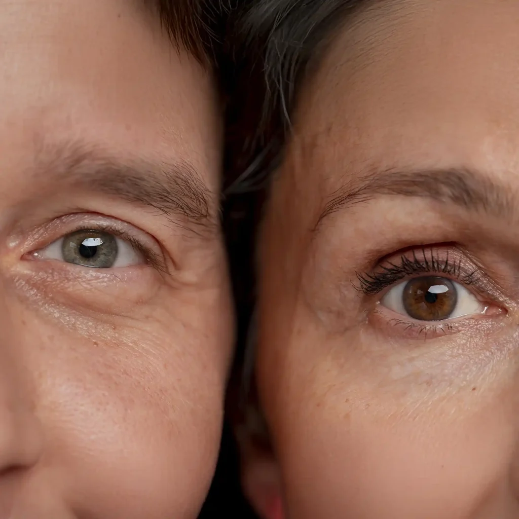 die eine Lidstraffung indizieren: Die Haut der Augenumgebung ist besonders dünn und zart, wodurch sie dem Prozess des Alterns stärker unterworfen ist als beispielsweise die zehnmal dickere Haut der Arme. Mit der Zeit zeichnen sich feine Fältchen ab, die Augenlider werden zunehmend von der absinkenden Haut herabgezogen und kleine Polster des Fettgewebes, in welches die Augen eingebettet sind, treten durch die schlaffer werdende Haut und Scheidewand vor (Tränensäcke). Je nach Form des Auges hat dies unterschiedliche Folgen. Bei Menschen mit „normal“ geformten Augen wirkt das gesamte Gesicht vorgealtert, nur weil die Augenumgebung besonders schnell erschlafft ist, etwa durch häufige Sonnenbäder oder eine ausgeprägte Mimik, aber natiirlich auch nicht selten durch familiäre Veranlagung bedingt. Durch die prominente Stellung der Augen im Gesicht fallen die Effekte der Hautalterung zusätzlich unangenehm auf.